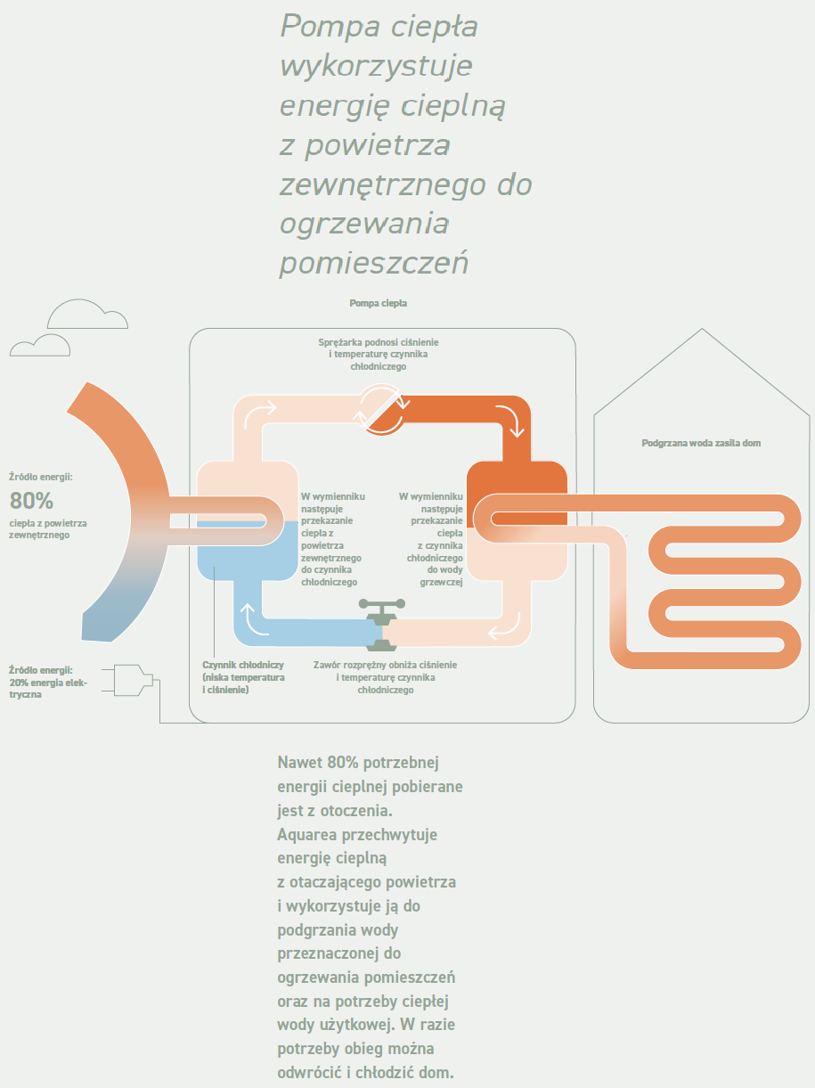 Mówiąc najprościej, idea, na której opiera się działanie pompy jest następująca: pompa ciepła powietrze-woda pozwala na spożytkowanie w domu ciepła z otaczającego powietrza — w sposób prosty i relatywnie tani. Składa się ona zawsze z jednego urządzenia zewnętrznego i jednego wewnętrznego, które są ze sobą połączone. Cała dostępna energia jest wchłaniana przez urządzenie zewnętrzne i przenoszona do urządzenia wewnętrznego. Stamtąd jest wprowadzana do obiegu grzewczego i rozprowadzana w budynku za pośrednictwem grzejników lub ogrzewania podłogowego.